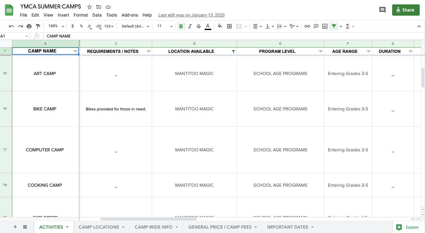 I reviewed the client provided content (e.g., camp packets and registration sheets) and to get a holistic view of all YMCA's Camp offerings I compiled everything into a google sheet to aid aggregate similar content (e.g., Activities), determine general info applicable to all locations (e.g., Important Dates, Age Ranges etc.) and delineate camp specific content (e.g., Price Fees.)